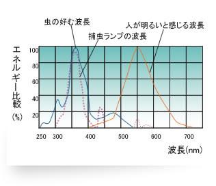殺虫器は、この虫の性質を利用して、虫が最も走光性を示す、近紫外線の波長(365nm)を出すランプを使用し、虫を誘引します。
