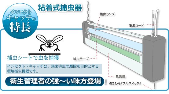 サンコーの新型捕虫器シリーズ「インセクト・キャッチ」は、光に集まる虫を専用捕虫シートで捕らえ、衛生環境の維持、 管理の器具として、さまざまな場所にご使用いただけます。 ![]() |