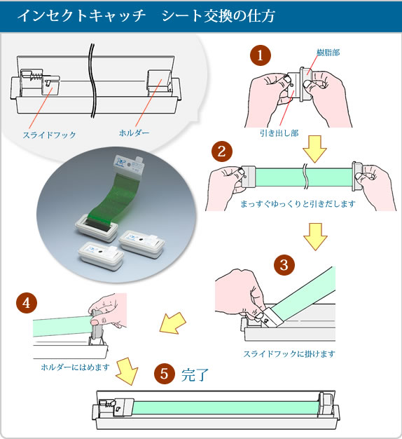 虫受トレイ・捕虫シート一体型ですので、手を汚さずに捕虫シートの交換ができます。 シート交換の仕方は下記をご覧ください。 |